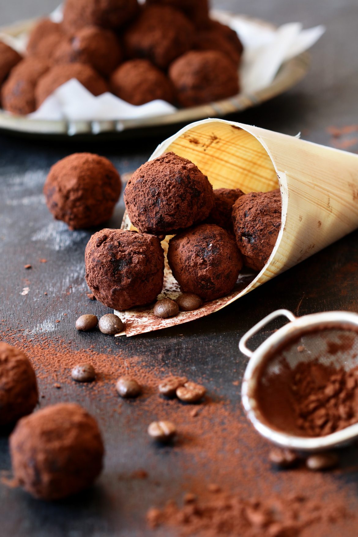 3. מרטיבים מעט את הידיים, ויוצרים מהעיסה כדורים קטנים. מפזרים בצלחת את תערובת הקקאו והקפה ומגלגלים בה את הכדורים. מאחסנים במקרר בכלי אטום עד כשבוע.